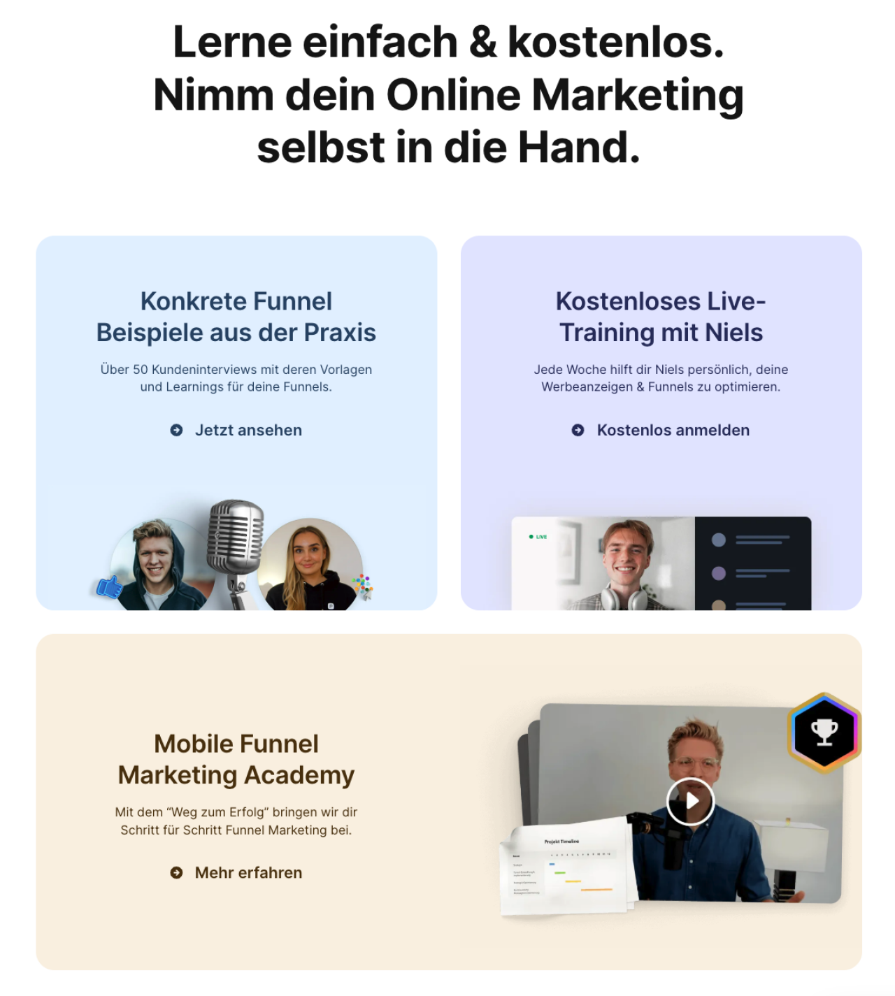 Fokus auf Call-to-Actions (CTAs): Buttons und Handlungsaufforderungen sind prominent platziert, oft über dem sichtbaren Bereich („Above the Fold“), und werden mehrfach strategisch wiederholt.