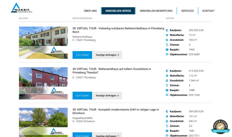 Dank der OpenImmo-Schnittstelle lassen sich sämtliche in deiner Maklersoftware gepflegten Daten zuverlässig auf deiner Website abbilden – inklusive Anfrageformular, Weiterempfehlung, Sharing-Funktionen, intelligenter Filter und vollständiger Objektinformationen. Ob Grundrisse, Energieausweis, Lagebeschreibungen, Bildergalerien oder die Darstellung auf einer interaktiven Karte mit POIs wie Schulen und Nahverkehr – alle Inhalte können automatisiert übernommen und individuell gestaltet werden. Auch eigene Felder aus der Maklersoftware lassen sich mit OpenImmo übertragen und auf deiner Website gezielt einsetzen.